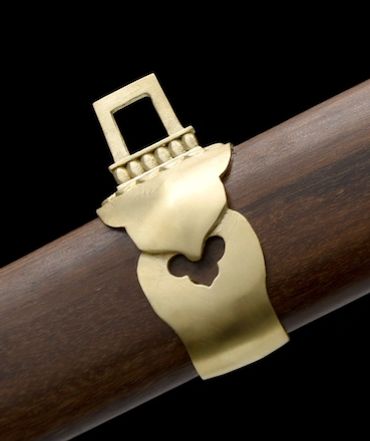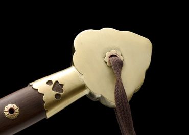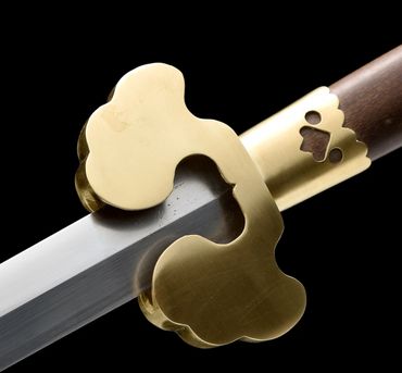 Precision cast brass fittings. The hand guard is in the Ming classic "Lingzhi" mushroom design. The pommel is in Ming classic gourd design. Scabbard hanging fitting is in Gourd leaves design. All symbolize longevity and good fortune.