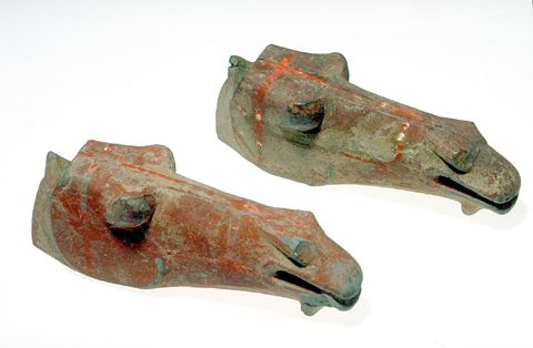 These two elegant red horse heads could be modeled after the famous Ferghana horses, sometimes called ‘blood sweating horses ‘(汗血馬) or ‘heavenly horses’ in Chinese literature. This unique breed – now extinct– is believed to come from the ancient kingdom of Dayuan in the Ferghana valley (modern day Uzbekistan). According to legend, these fast, powerful horses– whose red color was thought to be caused by sweating blood—were bred from heavenly stock and could even carry the rider to immortality.