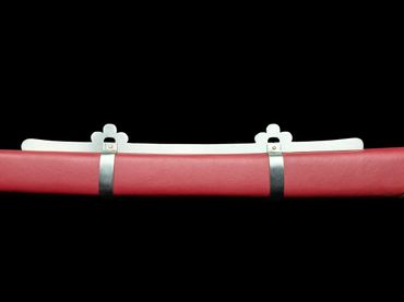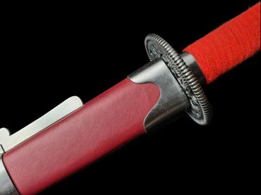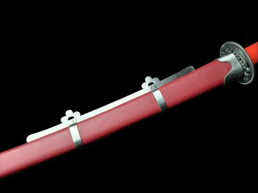 Scabbard made with wood core wrapped with wine read microfiber faux leather and cast stainless steel fittings