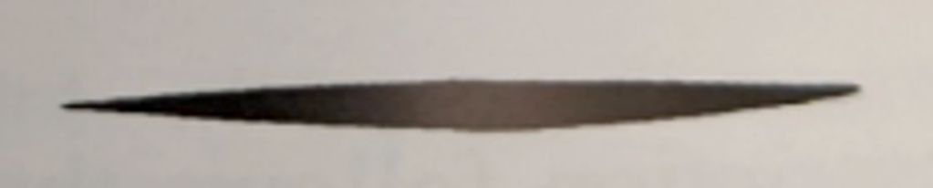 At the point of balance, showing a flattened hexagonal section with a thin central fuller and 2 outer grooves.